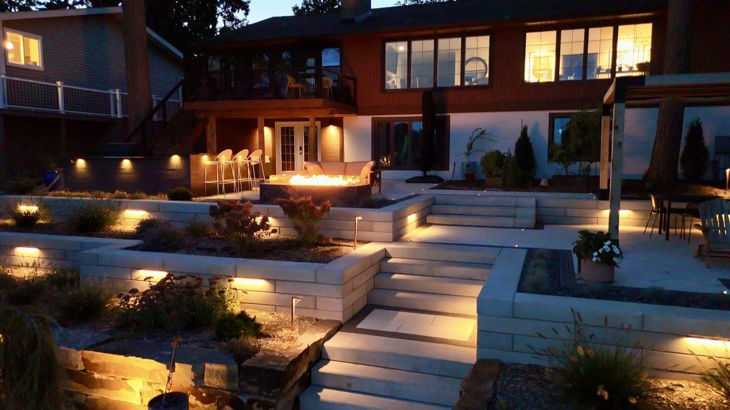 Most clients who work with us are seeking total renovations. We often design and build paver patios, retaining walls, seat walls, fire features, outdoor kitchens, low voltage lighting, surrounding plant beds, and sod restoration altogether in the same project.